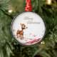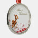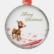Cute a Rudolf el reno de nariz roja sobre un fondo blanco con un adorno de fondo rojo y nevado. Navidades amables y divertidos diseñan su adorno de árbol de Navidad.
