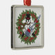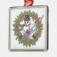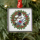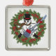 Un muñeco de nieve con su sombrero de punta y guitarra eléctrica se coloca en una corona verde y hueca con bayas y latas de dulces.