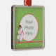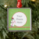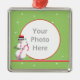 Un muñeco de nieve de tres dimensiones con gafas de sol y con un bastón de caramelo adorna este adorno de fotos de versión redondeada verde y rojo bonito. Subir una foto de vacaciones dentro del marco. ¡Genial para los niños!