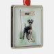 This Schnauzer personalized ornament features a watercolor design with a customizable name flag, framed in silver with a red ribbon. A sweet keepsake.