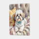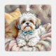 Un lindo tzu shih con un adorno de arco que puedes añadir un mensaje personalizado personalizado en la parte de atrás. La parte delantera tiene un lindo cachorro sentado sobre una colcha en el sofá.