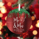 Un divertido ornamento fotográfico para recién casados que presenta "Mr & Mrs." en un elegante guión blanco, un ilustracion blanco de dos corazones se unió y un purpurina brillantemente verde goteando sobre un falso fondo metalizado rojo. Agregue su nombre y fecha de boda y su foto de boda en el reverso.