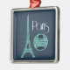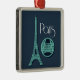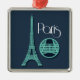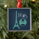 Este arte ofrece un diseño de la torre Eiffel en trullo en un fondo azul marino.