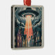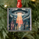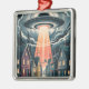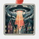 This dramatic illustration depicts a UFO hovering above a quiet suburban street at dusk, casting a vivid orange-yellow beam over houses and a lone figure observing the spectacle. Rich, moody colors of deep blues, purples, and grays contrast with the glowing beam, creating a retro-inspired, surreal atmosphere. Bold outlines and stylized details make this artwork perfect for fans of sci-fi, mysterious phenomena, and cinematic night scenes.