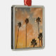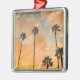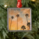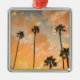 Esta foto ofrece una visión que mira hacia arriba en una arboleda de los árboles de palmas con las nubes del cielo azul y del naranja en un día soleado.