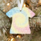 Este adorno navideño presenta un hermoso giro hippy estilo tintineo en rosa pastel, amarillo y azul sobre un adorno en forma de camiseta. Perfecto para alguien que ama el tintín de corbata o un tintineo temático.