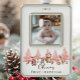 Simplemente perfecto ornamento de la Primera Navidad de Bebé con una dulce acuarela de la escena del bosque bebé con lindos animales de bosque vestidos con gorras rosas y bufandas.