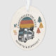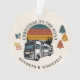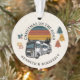 Este diseño es ideal para cualquier pareja que planee pasar Navidades en la carretera. Presenta un fondo con texturas de avena y colores retro, con un RV, árboles de Navidad, el año 2024, y Holly. La personalización está disponible para los nombres y en la parte posterior se incluye una nota dulce. Esto es genial para la pareja que ama RV durante los Navidades.