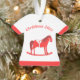 Este impresionante adorno navideño presenta una imagen de arte digital de un lindo caballo balancín al estilo escandinavo. El caballo es rojo con un mané rojo oscuro, cola y pezuñas. El caballo amistoso sonríe. Tiene una silla blanca y riendas con motivos folclóricos escandinavos bonitos en la silla, incluyendo el sol, la luna y las estrellas y los corazones y flores. La base del mecedor es roja y está cubierta de hojas blancas de bonito. El diseño se inspiró en el caballo Dala sueco. Hay texto personalizado en la parte delantera y posterior para que pueda incluir un año, nombre y mensaje.
