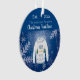 Un fondo azul con grandes copos de nieve blancos, cristales. Decorada con un desagradable jersey blanco de Navidad. Personalice y añada su apellido, año y título. El texto: Navidades Tradition se escribe en blanco con un moderno guión de estilo escrito a mano. Un adorno como un gran placer para tu primera Navidad como familia.