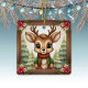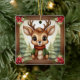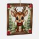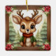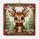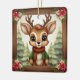 Adorno navideño caprichoso de Reno, decoración festiva de cerámica rústica cuadrada con marco de madera marrón, con flores de poinsettia de Navidad y un adorable animal bebé del bosque, ciervo único con cuernos en un estilo de arte gráfico de dibujos animados que lleva chaqueta y bufanda, de pie en primer plano. Árboles invernales completan el encanto de la temporada invernal de esta ilustración de personaje de cierva de fauna silvestre, lo que la convierte en un gran regalo. El diseño de cervatillo está en el frente y en la parte posterior. Así que no importa cómo gire el adorno colgante, siempre se ve festivo y completo. ¡Consigue el tuyo hoy!