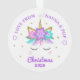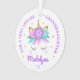Este adorno de unicornio de nieta personalizado presenta un bonito diseño de caras unicornio con flores y falsas estrellas purpurinas de oro. Personalice el texto en la parte delantera y trasera.