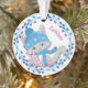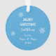 Un lindo gatito gris se sienta dentro de una corona azul cielo de vacaciones en la parte delantera de este adorno. El gatito lleva una gorra azul con copos de nieve blancos y bufanda de invierno. Ella sostiene un bastón de caramelo de rayas rosas y blancas. El nombre de su hijo es rosado en la parte superior derecha. El dorso del adorno es sólido a juego con el azul, con copos de nieve blancos dispersos y el texto personalizado en cinco campos. Fácil de personalizar, y a cualquier niña pequeña le encantaría este adorno de sake de un padre o abuelo.