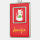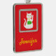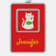 Este impresionante adorno presenta una imagen de diseño gráfico de un afortunado gato oriental blanco ondulado. El gato tiene hermosos ojos de oro y lleva puesto un medallón de oro en el cuello. El gato tiene orejas y bigotes rosas. Este lindo gatito sostiene una ficha de oro con entrada de jade verde y un mensaje en texto dorado que dice "Buena suerte". Hay texto personalizado para que pueda incluir un nombre.