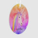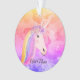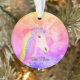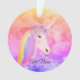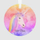 El ornamento personalizado las nubes coloridas lindas del arco iris del unicornio hace una gran idea para un regalo para un niño que ame unicornios. Fondo diseñado con colores del arco iris y un unicornio blanco lindo diseñado con el pelo del arco iris, las flores en su cabeza y nombre en escritura.