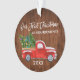 Guión de pincel moderno Nuestra primera Navidad como adorno de abuelos incluye Watercolor Vintage Camión Rojo con Árboles de Navidad, Luces, Nieve y Regalos de Navidad. Impresión rústica de madera de campo.