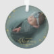 El ornamento de fotos de Navidades de personalizable para recién nacidos muestra una foto de bebé favorita a cada lado, con "Nuestra primera Navidad" elegantemente cubierta de caligrafía dorada. Personalízalo con el nombre y la fecha de su bebé.