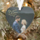 Un regalo memorable para los recién casados. Envíe esta hermosa foto en forma de corazón. Navidad adornada con nuevos casados para conmemorar a su boda, por su primera Navidad como Sr. y Sra. El adorno presenta "Nuestra primera Navidad" en una bonita letra de Relieve metalizado de oro con letras a mano con espacio para una foto. Personalice el adorno reemplazando la foto y el año. Para obtener los mejores resultados, utilice una foto recortada en una forma cuadrada. En nuestra tienda también hay disponibles más estilos y productos similares como tarjetas de vacaciones fotográficas, sellos postales, papel de envoltura de regalos, etc.