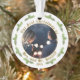 Nuestra primera Navidad como Sra. Ornamento fotográfico y Sr. Boda. Ornamento moderno para recién casados. El diseño tiene una foto en el marco del círculo, ramas de pino y texto en un guión dorado moderno Nuestra primera Navidad como señora. y Sr. comillas y año boda. Inserta su foto en la plantilla.