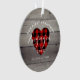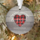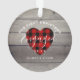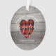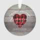 Sorprende que una pareja se case con nuestro primer ornamento de corazón con manos entrecruzadas de Nuestra Primera Navidad. Se trata de un establecimiento de diseño rústico con un fondo falso de madera de granero y un corazón de mantas de búfalo rojas y negras en el centro. El texto es "nuestra primera Navidad comprometida" seguido por el año personalizado y sus nombres. Haga clic en la opción Personalizar plantilla y siga las instrucciones