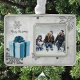Decore su árbol esta temporada de vacaciones con un adorno con un regalo de los Navidades azules enmarcado. El diseño de los adornos incluye un regalo de Navidades envueltos y vibrante adornado con copos de nieve grises y blancos sobre un fondo gris. También hay artículos de regalo y de vacaciones disponibles con este diseño.