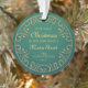 First Christmas in <add name of your street> Street in classic and simple serif and cursive script typography on a green background with ornate faux gold curves.