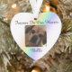 Honra la memoria de un querido mascota con este conmovedor adorno en forma de corazón con un suave fondo de arcoiris y la frase "Para siempre en nuestros corazones". Personalízalo con una preciada foto y agrega el nombre de tu mascota, como "Bella", para crear un hermoso tributo que mantiene su memoria cerrada cada temporada navideña. Este adorno ofrece una manera significativa de recordar a un compañero leal y hace un regalo reflexivo para amigos o familiares que han perdido a un mascota. Celebren su vida y el amor que trajeron con este conservadurismo especial que seguro caldeará los corazones.