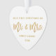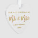 Escritura moderna del cepillo del oro nuestro primer navidad como Sr. y señora White y ornamento del corazón del oro - parte posterior de la foto