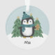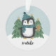 Este adorable adorno navideño presenta un pingüino dibujado a mano, con un gorra y una bufanda de azul verde azulado. Está parado frente a algunos árboles de Navidad y sosteniendo una galleta de pan de jengibre, mientras está nevando en el fondo. Se incluye una plantilla de texto con un tipo de letra elegante para facilitar la personalización en el frente y la parte posterior contiene una plantilla de texto para el año. *Ilustracion original de Orabella Prints.