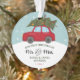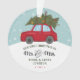 Moderno pincel escritura Sr. y Sra. con un coche rojo que lleva un árbol de Navidad en formato de ilustración. Un verdadero recuerdo para los recién casados.