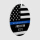 Brillante policía de la Línea Azul Oficial Ornamento de Navidad - Bandera estadounidense con colores de la bandera de la policía, diseño moderno negro y azul. Personalizar con el nombre de su departamento, y personalizar con el nombre y número de placa de los oficiales de policía. Este adorno personalizado para la aplicación de la ley es perfecto para los departamentos de policía y los agentes del orden, los empleados de abasto y los regalos de los navidades a los oficiales de policía. Ordenar estos ornamentos de la policía al por mayor para regalos de la academia de policía o del departamento de policía, navidades de policía abasteciendo a los fieles. DERECHOS RESERVADOS © 2020 Judy Burrows, Black Dog Art - Todos los derechos reservados. Ornamento de aplicación de la ley de la Línea Azul delgada personalizado de la policía