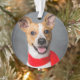 Elegante adorno conmemorativo de vacaciones redondo para la pérdida de un perro mascota, gato u otro ser querido, incluye una foto en la parte delantera y el personalizado 'Para siempre en nuestros corazones' con nombre y esperanza de vida en la parte trasera. Se pueden personalizar el color de fondo rojo y los tipos de letra.