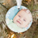 El elegante diseño de adorno de fotos navideñas enmarcado por copos de nieve enmarcado por un bebé presenta una corona de nieve blanca de invierno que enmarca la foto del recién nacido bebé. En la parte de atrás aparece un mensaje de personalizado "Primera Navidad del bebé" con un texto que puede ser personalizado con el nombre del bebé y el año de nacimiento. El esquema de color azul y gris pizarra del bebé se puede cambiar para que coincida con tu foto.
