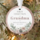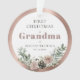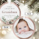 Primer Navidad como Abuela Personalizado con el nombre del bebé, fecha de nacimiento y foto Ornamento de recuerdo de acrílico redondo... Un delicado ramo de rosas rosadas, piñas y elementos botánicos de la temporada navideña decora el marco metálico de rosa dorado que rodea el texto en la parte delantera de su regalo de adorno navideño para familiares. En la parte posterior del adorno está la foto del nieto también enmarcada en rosa dorado metálico. El texto de ejemplo en este ornamento conmemorativo dice "Primer Navidad como Abuela de Bethany Westfield 15.05.2025". Todo el texto de ejemplo y la foto del marcador de posición se pueden revisar fácilmente con los suyos en la plantilla de personalización.