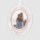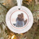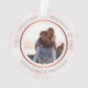 Este adorno navideño personalizado presenta un diseño moderno de oro falso rosa sobre un fondo falso de mármol rosa. Personalice los nombres, año y foto. Esta plantilla funciona mejor con fotos en formato de paisaje con la pareja en el centro.