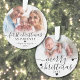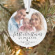 Primera Navidad Como Padres Recién nacido 2 Ornamento De Foto. Celebra la alegría de tu primera temporada de vacaciones como nuevos padres con este elegante adorno personalizado. La parte delantera incluye una preciada foto de su bebé o un momento dulce de los padres con su recién nacido, bellamente adornado con la frase "Primera Navidad como padres" en caligrafía de escritura y una fuente serif clásica, junto con el año para un toque personal. La parte trasera ofrece espacio para una segunda foto, ideal para una instantánea adicional de su bebé o una foto significativa de la familia, acompañada de "Feliz Navidad" en el mismo delicado guión con el año mostrado en la parte inferior. Los acentos del corazón negro y un suave efecto sombrío en la parte inferior de cada foto añaden calidez y elegancia, y tanto el tipo de letra como los colores del corazón se pueden personalizar para que coincidan con tu estilo. Este adorno de sake es perfecto para celebrar tu primera Navidad en familia y hace una adición más sincera a tu decoración de vacaciones.