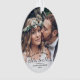 Celebrar una alegre primera festividad como pareja casada con una elegante foto personalizado "Nuestra primera Navidad como Sr. y Sra." adorno acrílico oval. Las imágenes y todos los textos de esta plantilla son fáciles de personalizar. El diseño de overlay en blanco y negro presenta una sencilla y elegante caligrafía de escritura, modernos nombres de tipografía minimalista y año, y dos imágenes de su elección. La fecha de boda de la pareja está impresa en la parte posterior. Este toque boda único hace de la novia y del novio una elegante idea de regalo de bodas y le da un toque elegante a la decoración de la casa recién casada de Navidad.
