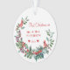 Navidades elegantes de color acuático rústico invernal usaron un adorno acrílico de plantilla con un follaje botánico rojo coral, borgoña y verde con pinos estacionales, ramas de abeto, bayas huecas, aves cardinales y hojas, y un guión moderno de tipografía a la moda sobre un fondo blanco claro. +++++++++++++++++- Personalízalo en ambos lados con su nombre familiar, texto y foto personalizado!