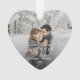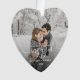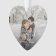 Conmemorar su compromiso con este hermoso adorno de keepsake en forma de corazón. El texto blanco dice "Nuestra primera Navidad comprometida", con la palabra "comprometida" en un elegante guión de escritura a mano con flores antes y después. Reemplace la imagen de ejemplo con su foto favorita y agregue sus nombres y el año. Un filtro de degradado negro ayuda a hacer que el texto aparezca.