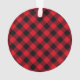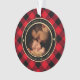 Este adorable adorable adorno de Navidad con temática rústica para los nuevos papás muestra tu foto con el bebé y papá en el frente bordeado con un marco circular de oro y negro sobre un fondo rojo y negro de manto de búfalo. Las palabras en la tipografía de oro falso dicen "~MY PRIMER NAVIDAD COMO HH DADDY" con el nombre y el año de su bebé para personalizar. Hace un regalo único para los padres primerizos. Diseñado por la artista ©Susan Coffey.