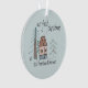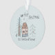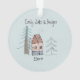 Ornamento de Navidad para su primera Navidad en su nuevo hogar. Dibujo de doodle de una casa en el bosque con tipografía caprichosa. La redacción está lista para ser personalizada y dice "nuestra primera Navidad en [nueva dirección]". También puedes añadir tu nombre y el año en la parte trasera.