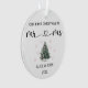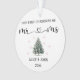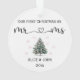 Ornamento de Navidad redondo, blanco y decorado con elegante escritura negra que dice "NUESTRA PRIMERA NAVIDAD COMO la Sra. H." Debajo del texto, hay un encantador ilustracion de un árbol de Navidad adornado con adornos suaves de color rosa, rodeado de pequeños copos de nieve rosados. En la parte inferior del adorno se encuentran los nombres de los personalizables y el marcador de posición del año. El diseño general es festivo y romántico, creando un keepsake personalizado para las parejas que celebran su primera Navidad juntos como Mr. y Ms.