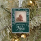 Celebra su primera Navidad como abuela con este adorno de fotos dulce que presenta una foto de un bebé enmarcada con copos de nieve blancos cayendo sobre un fondo verde del bosque. "Promoted to Nana" aparece debajo de la inscripción blanca rústica, junto con el año.