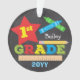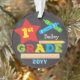 Este adorno de primer grado presenta una estrella, una regla, un lápiz, crayones y una tipografía divertida y audaz en colores brillantes. Haga clic en el botón personalizar para obtener más opciones para modificar el texto. Variaciones de este diseño, colores adicionales, así como productos coordinados están disponibles en nuestra tienda, zazzle.com/store/doodlelulu. Contáctenos si necesita este diseño aplicado a un producto específico para crear su propio artículo coincidente único. ¡Muchas gracias por ver un diseño de DoodleLulu by 2 june bugs!