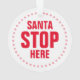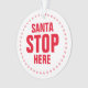 Santa Stop Here rojo y blanco adorable adorable adorno navideño. rodeado de una delicada corona de copos de nieve.