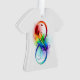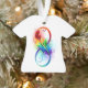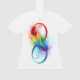 Símbolo de infinito dibujado artísticamente con una hermosa pluma arco iris sobre fondo blanco. Estilo tatuaje.
