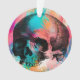 La imagen frontal es la de un dibujo en blanco y negro de un cráneo anatómicamente correcto, y el fondo es una colorida pieza inspirada en la cosecha vintage de mi diseño. Juntos hacen una decoración maravillosamente mórbida, pero colorida, para tu árbol de Creepmas o de Navidad si eres tan inclinado!