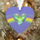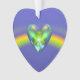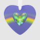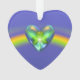Ornamento colgante con mi diseño 3d verde y azul de un shamrock dentro de un corazón esmeralda brillante con un arcoiris colorido y cielo azul.