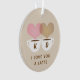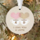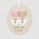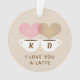 Un adorable adorno de vacaciones de Navidades personalizados "te amo un café latte" para los amantes del café. Incluye dos tazas de café con vapor en forma de corazón marrón y rosa claro entrelazado y un fondo de color crema. Personalice el texto del personalizado con las iniciales del nombre de la pareja. El diseño de dos caras incluye la misma imagen y texto en ambos lados.