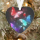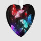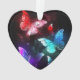 Tres mariposas luminosas, rojas, violetas, verdes, texturadas, nocturnas sobre fondo luminoso negro.